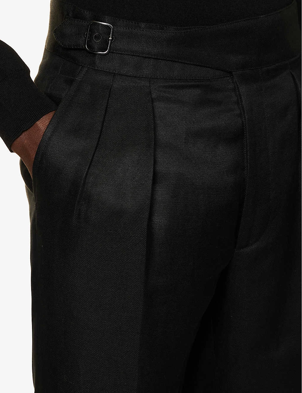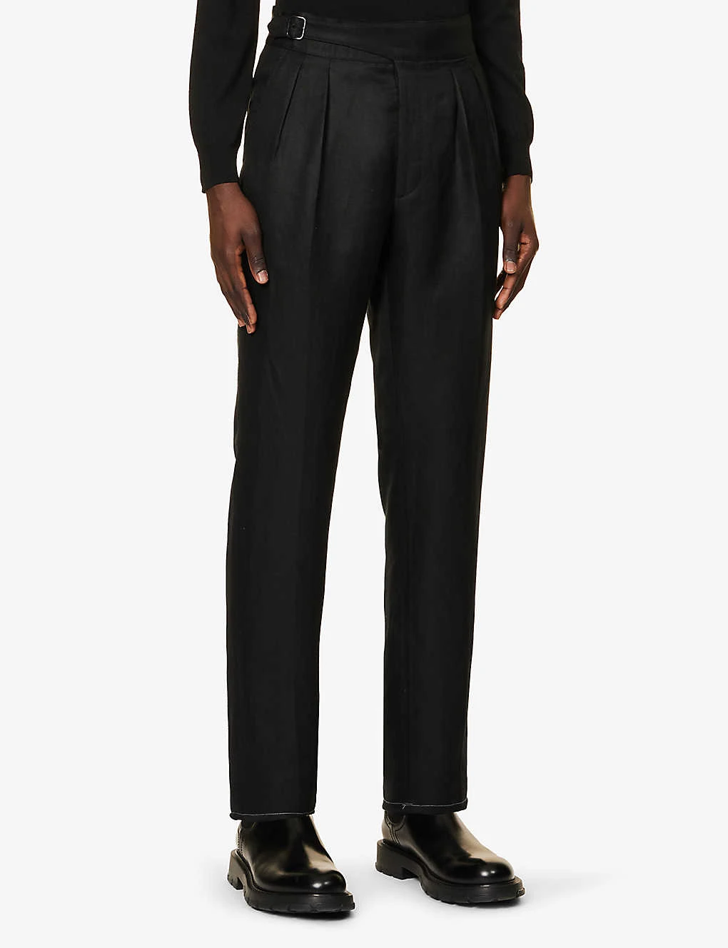 - Regular fit, high-rise, straight leg, belt and two slip pockets at front, pleats at front, two buttoned pockets at back, pressed creases at front and back, straight cuffs