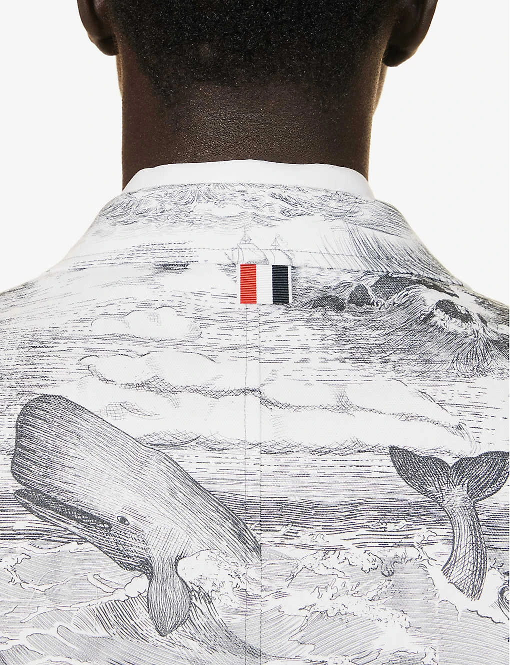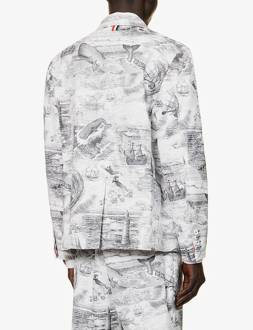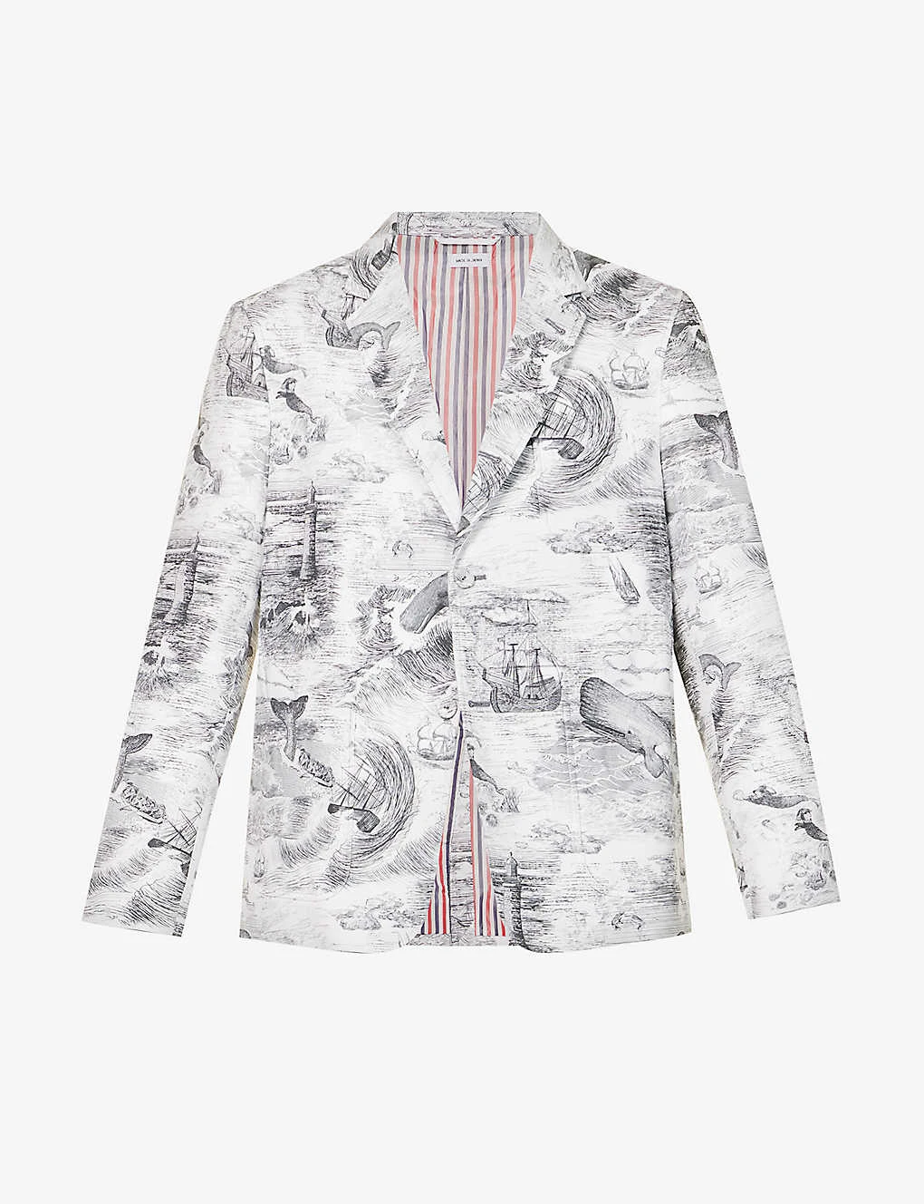 - Regular fit, notched lapels, padded shoulders, long sleeves, buttoned cuffs, patch pocket at chest, darts at front, two patch pockets at front, brand patch at back, vent at back, all-over graphic design, three slip pocket at interior, fully lined