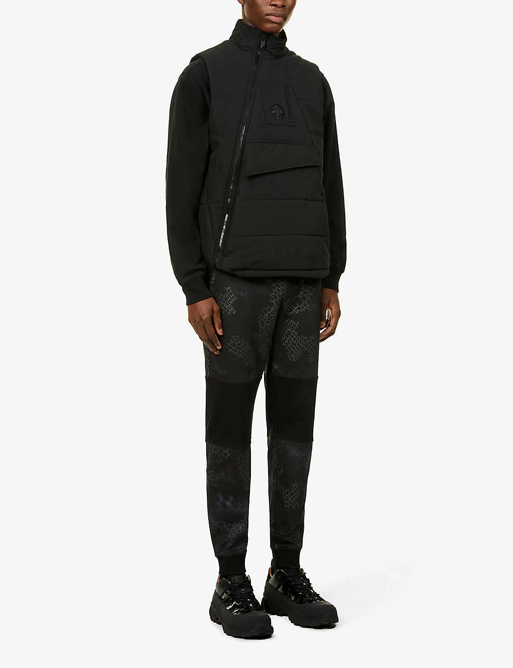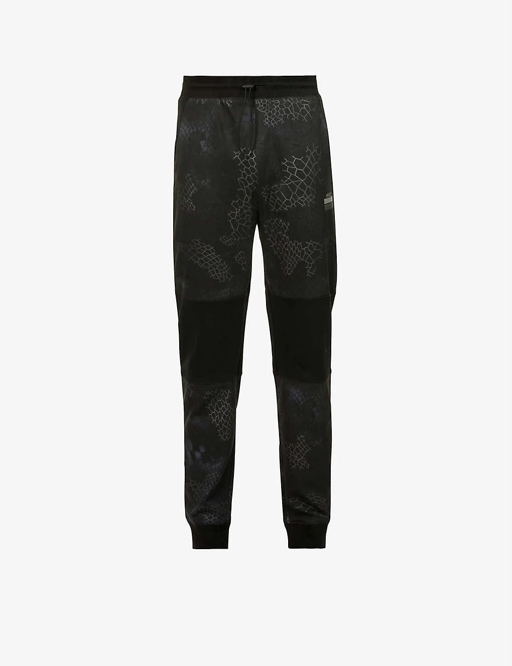 - Relaxed fit, mid rise, tapered leg, elasticated drawstring waistband, slip pockets, brand print at side, all-over geometric print, one patch pocket at back, ribbed hems