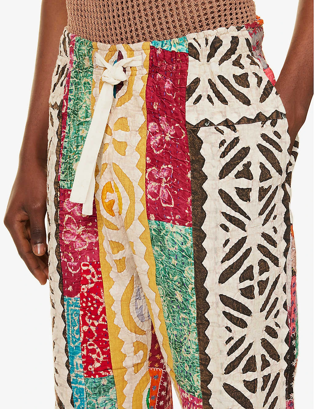 - Relaxed fit, mid-rise, elasticated drawstring waistband, wide tapered leg, two slip pockets at sides, patch pocket at back, all-over patchwork Godhadi quilt, hand-embroidered, partially lined