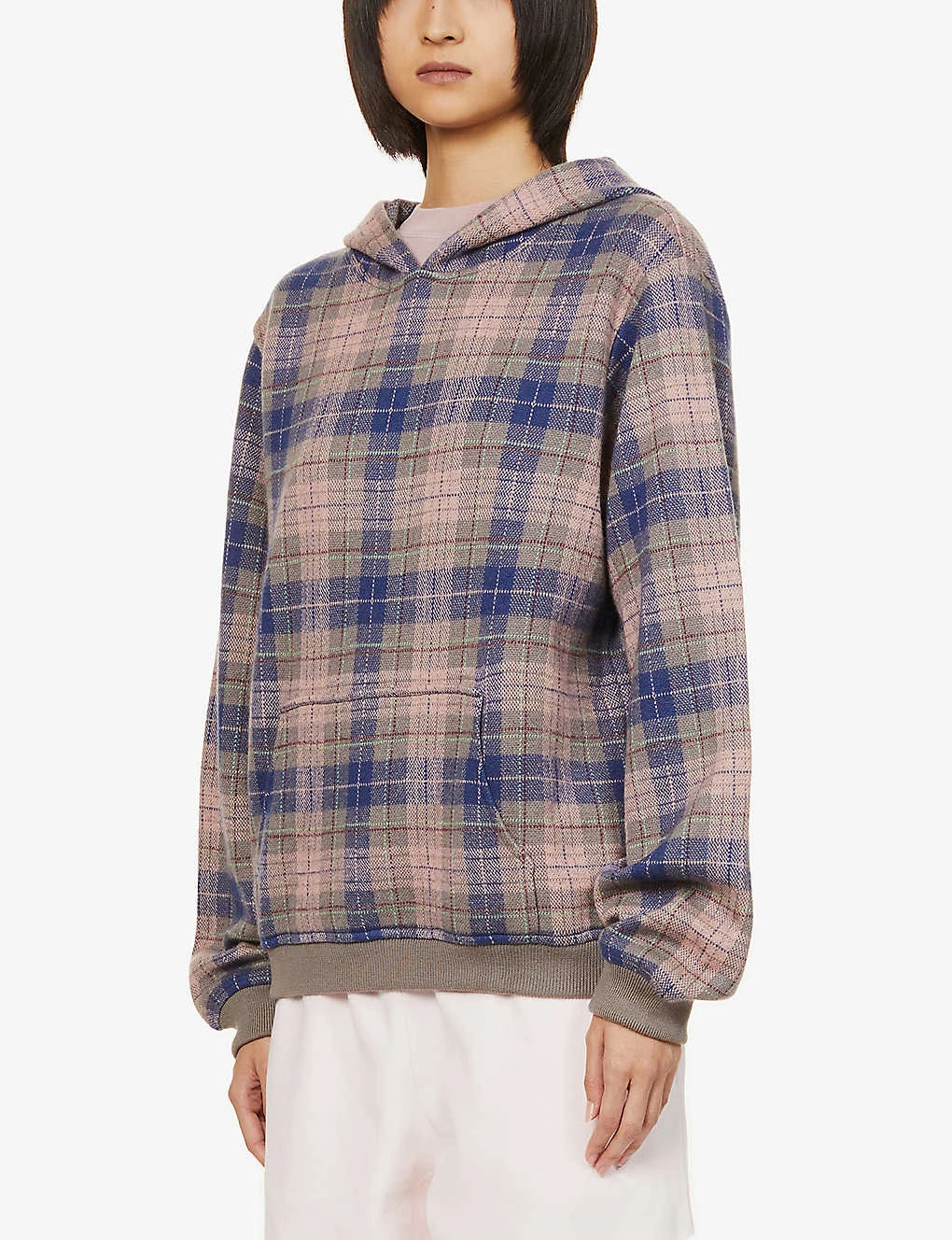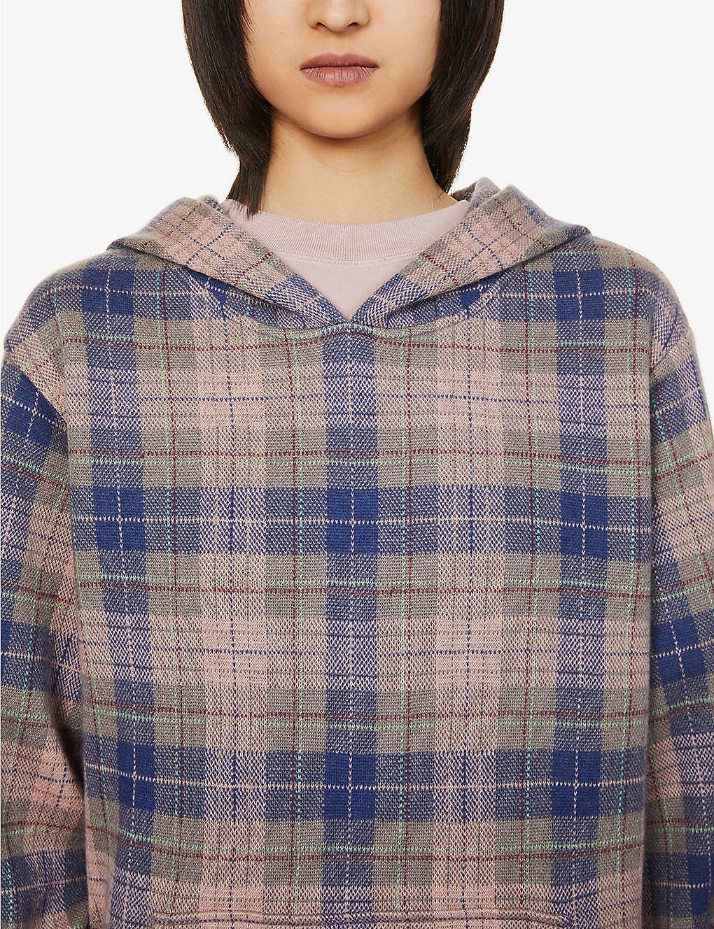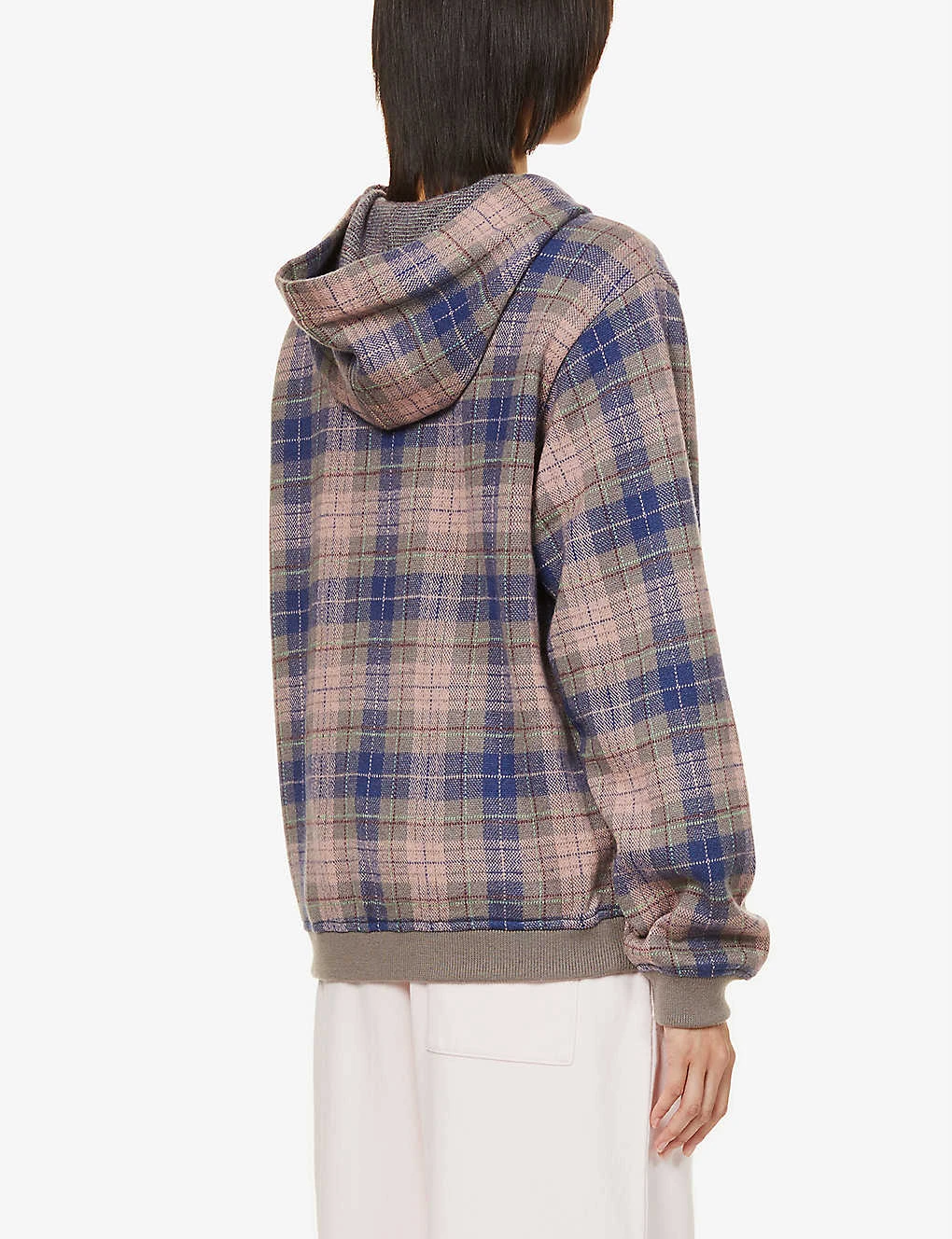 - Relaxed fit, hood, dropped shoulders, long sleeves, kangaroo pocket at front, lapis lazuli popper fastening at side, all-over plaid pattern, ribbed trims